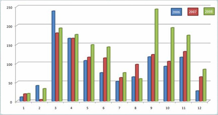 3. 展覽數(shù)量在趨于平均,比如春季的3個(gè)月和秋季的3個(gè)月,而比較一下三年前的展會(huì)(見下一張圖),近兩年來,這個(gè)現(xiàn)象是不明顯的,而以前,3月和9月有明顯的數(shù)量優(yōu)勢。