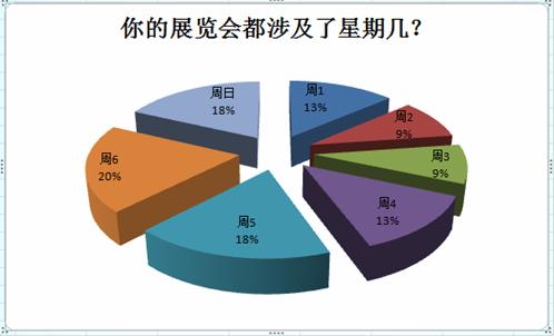 本報(bào)告還對每個(gè)展會(huì)涉及一周的哪幾天進(jìn)行了統(tǒng)計(jì)(統(tǒng)計(jì)工作量很大,但邏輯很簡單,就是對每個(gè)展覽會(huì),每天算一遍,看屬于哪一天),下表是統(tǒng)計(jì)的數(shù)據(jù),您可以看到:20%的展會(huì)都會(huì)有周六的一天,而作為對比,涉及了周二、周三的比例只有9%。