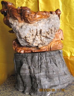 配之原作,不僅沒有喧賓奪主,相反底座與作品相得益彰,使作品更氣勢大度,使人似乎感悟到“收藏既是藝術(shù)品的集聚,更是精神財富的擁有”,另外《愚公移山》黃花梨根抱石配之以廣西幽蘭石的底座,更是難得一見的收藏精品,去年在展覽會榮獲第四屆“百慧杯”中國藝術(shù)家具“匠心神工”精華大賽工藝品類創(chuàng)意金獎。