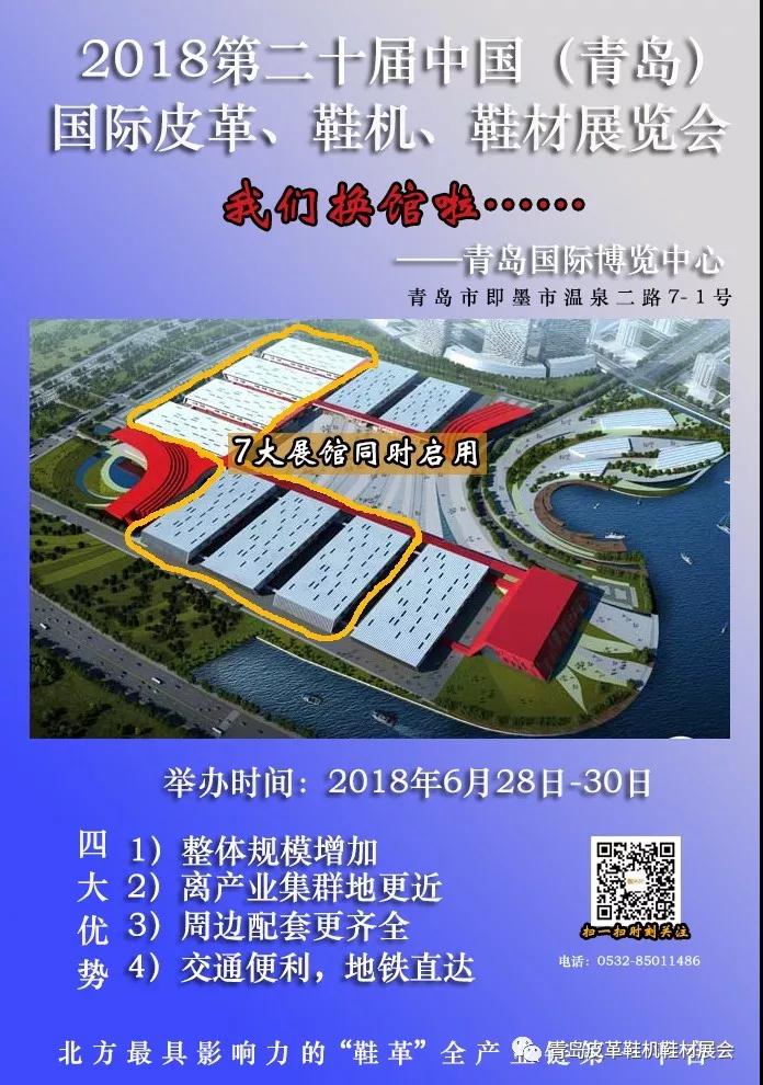 2018第二十屆中國(青島)國際皮革、鞋機(jī)、鞋材展覽會——2018年6月28日-30日在青島國際博覽中心舉辦。屆時將秉承佳績,打造「北方專業(yè)的“鞋\箱包\皮具”生產(chǎn)全產(chǎn)業(yè)鏈展覽會 」,以“新設(shè)備、新材料、新技術(shù)”為主題,開啟制鞋產(chǎn)業(yè)新時代。同期舉辦的有「2018山東紡博會」。展出規(guī)模比去年有了大幅度提高,總面積達(dá)80,000平方米,參展商2500家。吸引了來自美國、日本、韓國、德國和意大利等多個海內(nèi)外著名品牌前來參展,海內(nèi)外80000余采購商買家團(tuán)到會參觀,展會期間舉辦各種論壇活動80余場次,近200家新聞媒體進(jìn)行新聞報道。