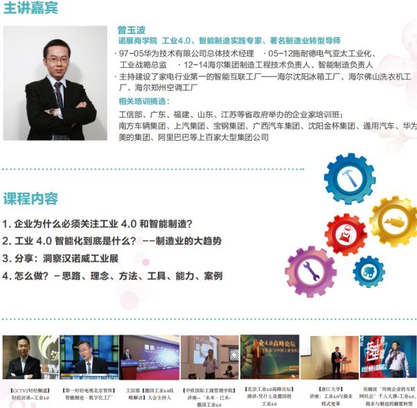 2018年金諾濟南機床展開展在即,配套推出《工業(yè)4.0與企業(yè)智能化轉(zhuǎn)型》培訓(xùn)課程,由榮登央視的智能制造實踐專家、著名制造業(yè)轉(zhuǎn)型導(dǎo)師曾玉波親臨現(xiàn)場,進行授課與指導(dǎo)。
