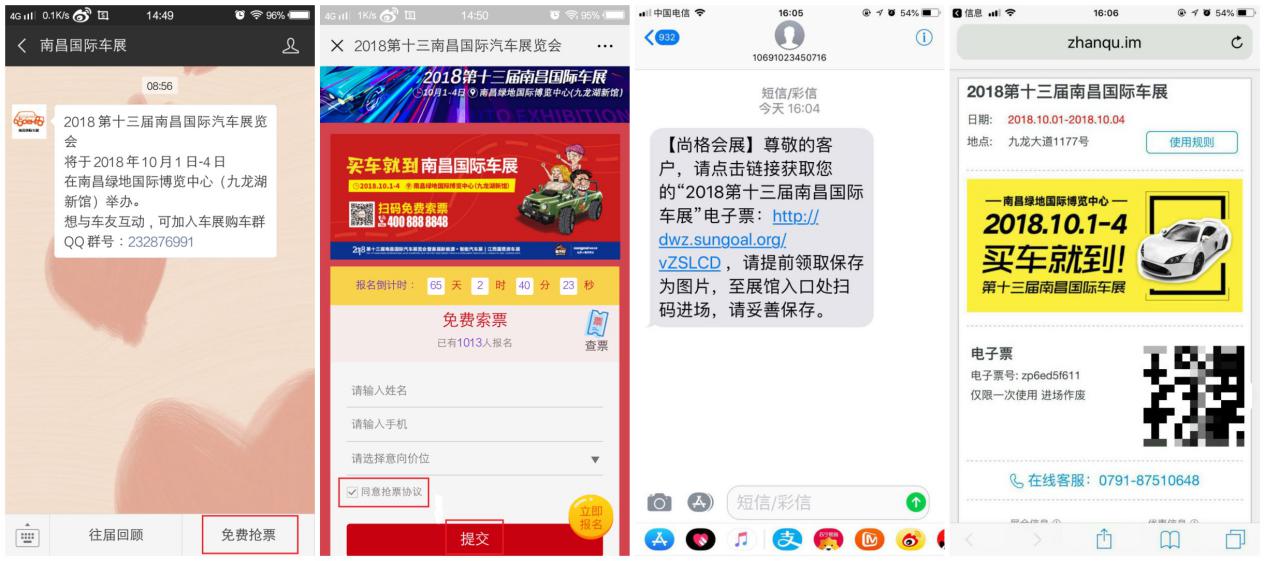 本屆南昌國際車展的免費搶票福利也已全面上線。只需關(guān)注“南昌國際車展”微信號,點擊下方【免費搶票】進(jìn)入頁面提交信息即可。官方客服電話回訪核對信息后,電子門票直接發(fā)送到您的手機(jī)上,點開鏈接查看電子票;入場前可以進(jìn)入官方微信【南昌國際車展】點擊菜單【票證查詢】進(jìn)入查詢頁面即可打開電子票圖片;