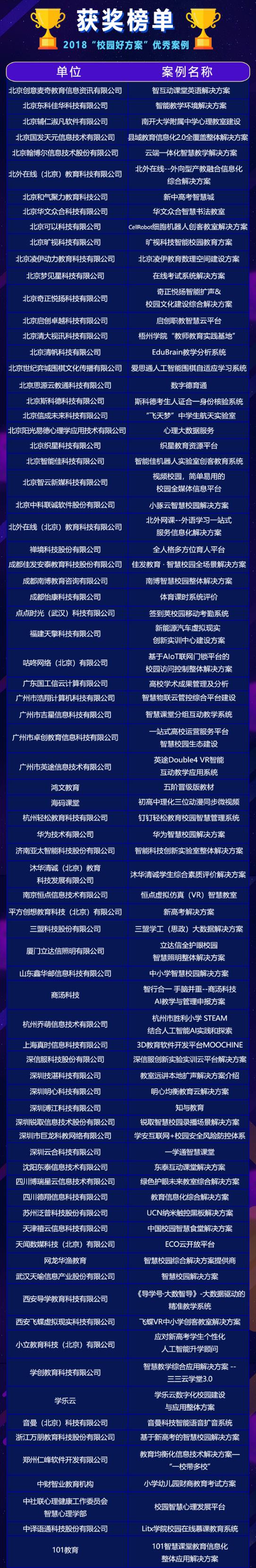 是不是按奈不住激動(dòng)的內(nèi)心了?本次將首輪公布“第五屆校園好方案”評(píng)選活動(dòng)——“2018智慧教育優(yōu)秀案例企業(yè)”榜單,內(nèi)容如下,看看你上榜了嗎?