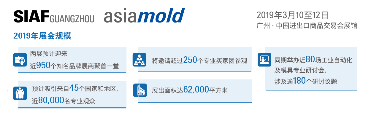 第十三屆廣州國際模具展覽會(Asiamold)于2019年3月10至12日再度在廣州中國進出口商品交易會展館舉行,聯(lián)手SIAF廣州國際工業(yè)自動化技術及裝備展覽會,兩展將共同展示貫穿從模具、3D打印、智能制造,到生產自動化的工業(yè)生產鏈,助力業(yè)界開拓“中國制造2025”戰(zhàn)略所帶來的龐大商機。。