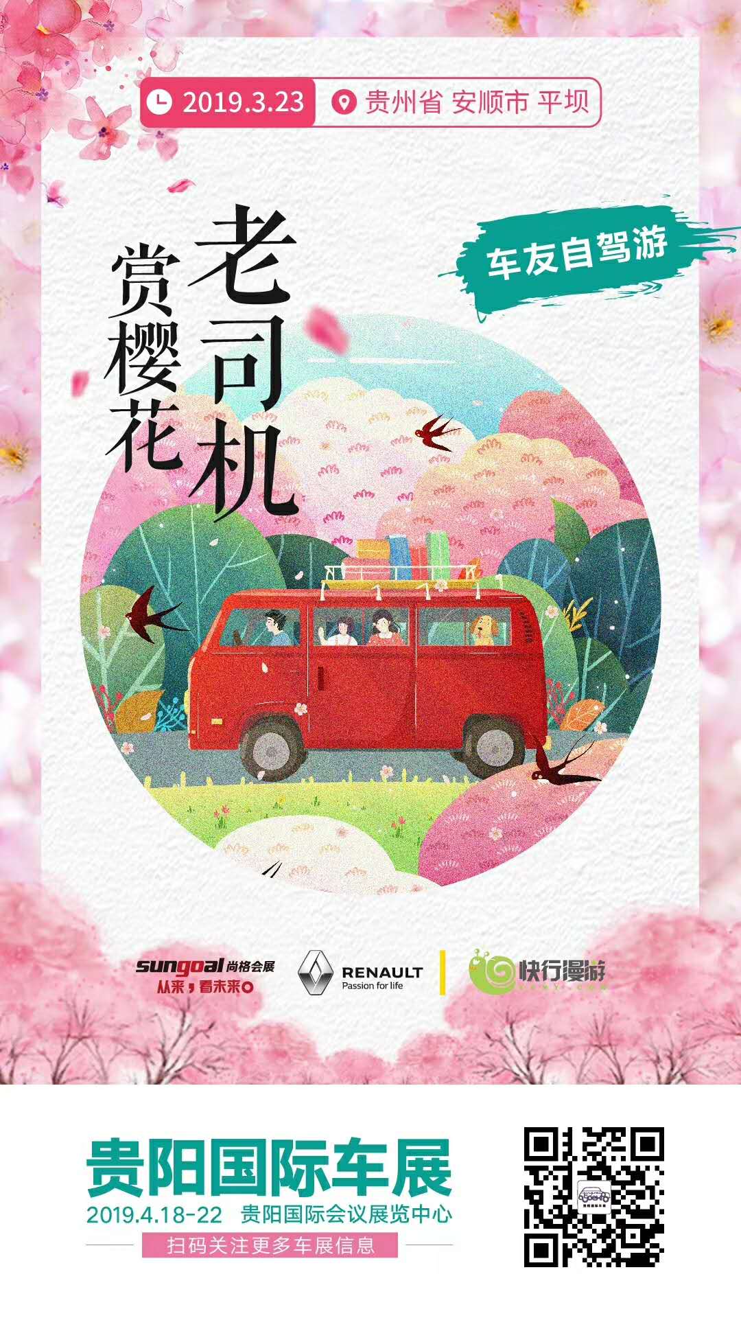 陽春三月,櫻花爛漫。2019年3月23日,2019貴陽國際車展與貴州十和田風(fēng)景雷諾聯(lián)合舉辦的“老司機(jī).賞櫻花”車友自駕游活動圓滿舉行!本期參與活動的雷諾車主正式成為“貴州365自駕車友會”首批會員,感謝所有車主和貴州黃果樹智慧旅游股份有限公司、平壩櫻花萬畝園景區(qū)和貴州風(fēng)景汽車銷售服務(wù)有限公司的大力支持。預(yù)祝4月18-22日所有2019貴陽國際車展車商大賣!