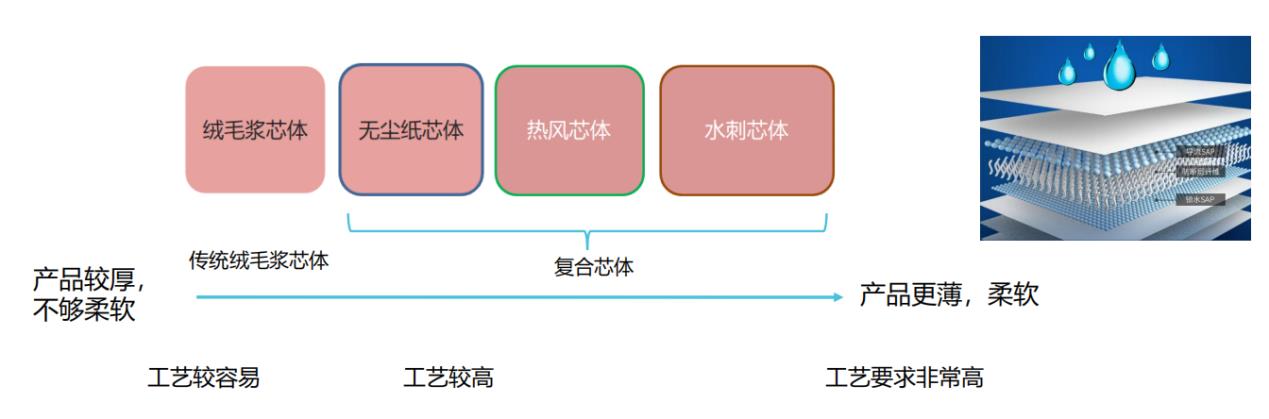 5.芯體下層吸收層:主要有無塵紙、熱風無紡布及水刺布,包裹SAP并有一定的擴散作用。