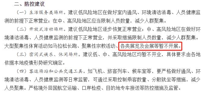 2020年,一場疫情給全球會展行業(yè)按下了“暫停鍵”。雖然全國疫情防控形勢持續(xù)向好,但國際防控形勢變得尤為嚴(yán)峻復(fù)雜。根據(jù)國務(wù)院于2020年4月6日下發(fā)的《關(guān)于進一步做好重點場所重點單位重點人群新冠肺炎疫情防控相關(guān)工作的通知》。《通知》指出大型聚集性體育活動如馬拉松長跑、聚集性宗教活動、各類展覽及會展等暫不開展。