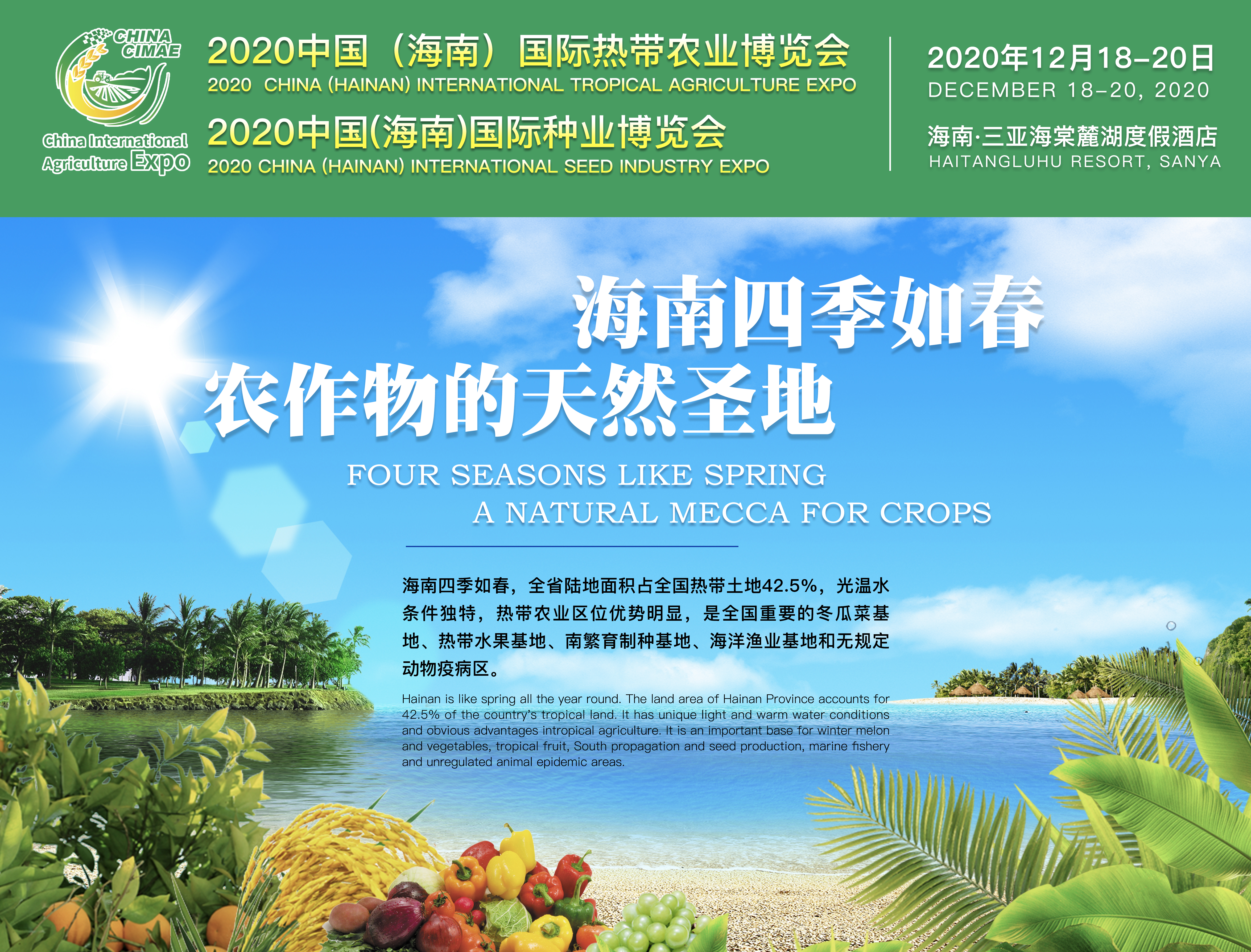 內(nèi)容摘要:農(nóng)業(yè),是關(guān)系國計(jì)民生的產(chǎn)業(yè),政府工作報(bào)告中明確提出:促進(jìn)農(nóng)林牧漁業(yè)和種業(yè)創(chuàng)新發(fā)展,加快建設(shè)現(xiàn)代農(nóng)業(yè)產(chǎn)業(yè)園和特色農(nóng)產(chǎn)品優(yōu)勢區(qū),穩(wěn)定和優(yōu)化糧食生產(chǎn)。2020年伊始,全國各行各業(yè)遭遇新冠肺炎疫情影響,對(duì)我國農(nóng)業(yè)發(fā)展以及目標(biāo)實(shí)現(xiàn)造成了重大困難。如何將疫情對(duì)“三農(nóng)”影響降到最低,保證糧食等重要農(nóng)產(chǎn)品穩(wěn)產(chǎn)保供,成為上至政府、下至市場、各相關(guān)企業(yè)面臨的一道重要課題。國家商務(wù)部為支持會(huì)展業(yè)快速發(fā)展,出臺(tái)文件并提出13項(xiàng)具體要求。海南國際熱帶農(nóng)業(yè)博覽會(huì)作為海南省唯一的農(nóng)業(yè)高新技術(shù)、生產(chǎn)資料交流貿(mào)易平臺(tái),為積極應(yīng)對(duì)肺炎疫情、助力農(nóng)業(yè)發(fā)展,特推出“商旅+食宿一條龍會(huì)展新模式”。