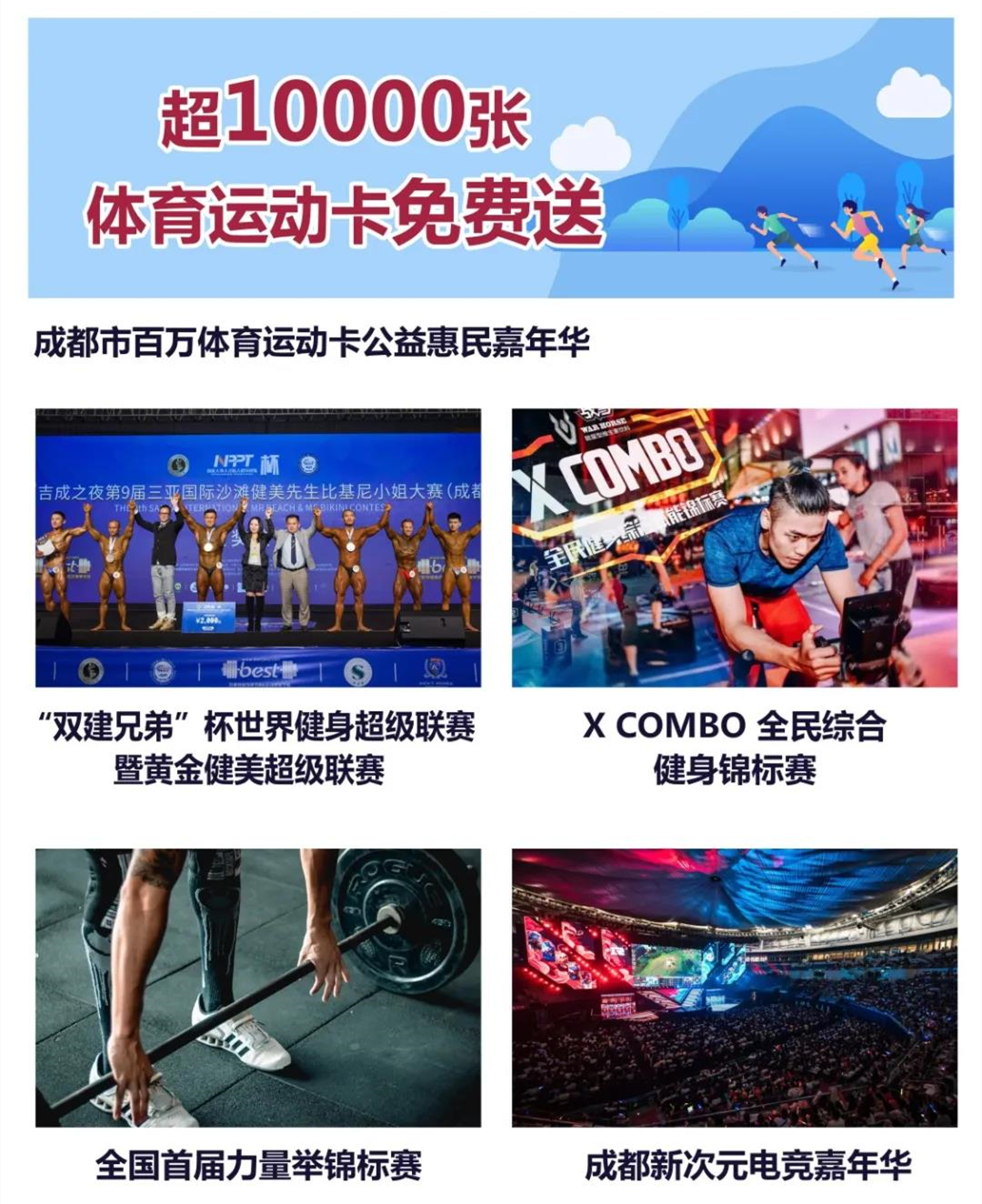 它還有2020xcombo綜合健身錦標賽、成都新次元電競嘉年華等更多面向全成都體育運動愛好者的賽事活動,以及面向青少年的體育運動培訓,面向健身康體、戶外運動、場館設(shè)施企業(yè)的展覽展示,將打造一場全民參與,全民共享的體育運動狂歡盛宴。
