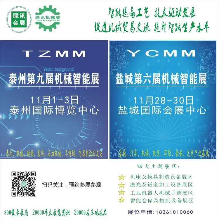 “2020中國泰州第九屆國際機械與智能制造展覽會“將于2020年11月1-3日在泰州國際博覽中心盛大舉行!作為2020下半年蘇中蘇北地區(qū)唯一大型機械行業(yè)展會,是您開發(fā)高速發(fā)展的蘇中市場首選展會平臺。我們2019年的機械展有約350 名參展商,800個展位和25000名采購商,吸引了包括美國哈斯,美國哈挺,美國辛辛那提,韓國斗山,日本發(fā)那科,日本津上,臺灣協鴻,海天精工,南通科技,力星激光,嘉泰激光,漢鋒自動化,大華激光,捷豹空壓機等眾多知名品牌。在我們的不懈努力下,2020年的展會預計有約400家參展商,1000個展位和近30000名的采購商,是您不容錯過的工業(yè)盛宴!