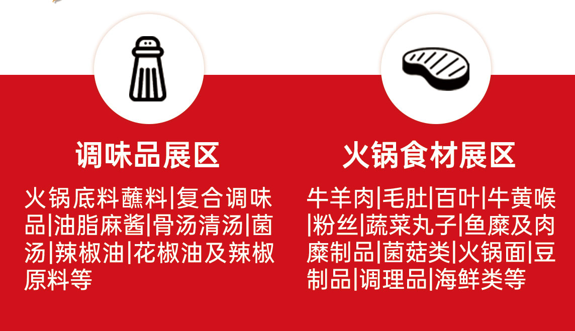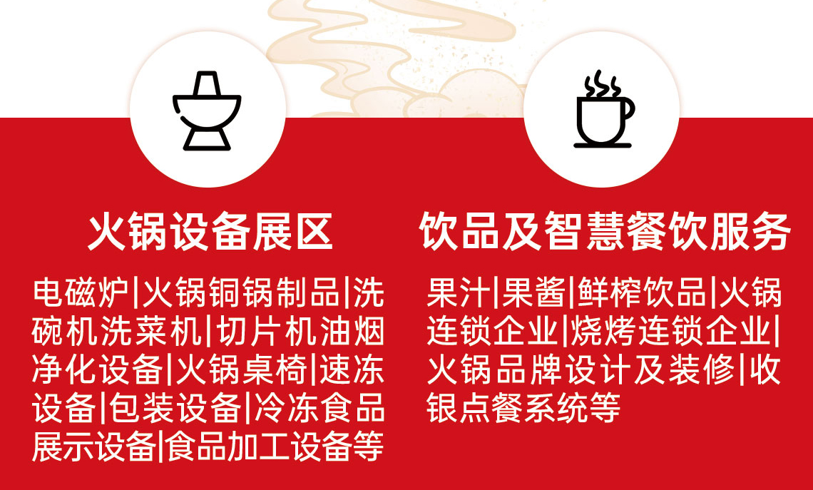 本屆展會特設(shè)北派火鍋展區(qū)、川渝火鍋展區(qū)、調(diào)味品展區(qū)、火鍋食材展區(qū)、火鍋設(shè)備展區(qū)、飲品及智慧餐飲服務(wù)展區(qū)等6大展區(qū)。