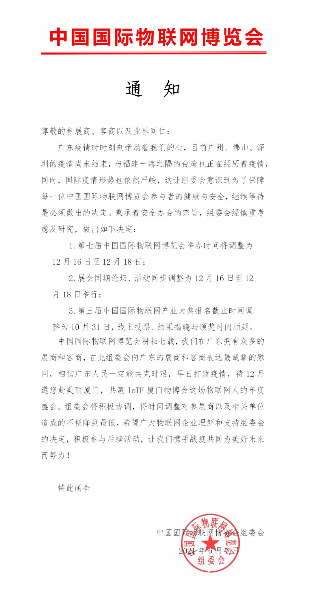 廣東的疫情時時刻刻牽動著我們的心,目前廣州、佛山、深圳的疫情尚未結束,與福建一海之隔的臺灣也正在經歷著疫情,同時,國際疫情也依然嚴峻,這讓組委會意識到為了保障每一位中國國際物聯(lián)網博覽會參與者的健康與安全,繼續(xù)等待是必須做出的決定,綜合當前形勢,組委會作出以下決定: