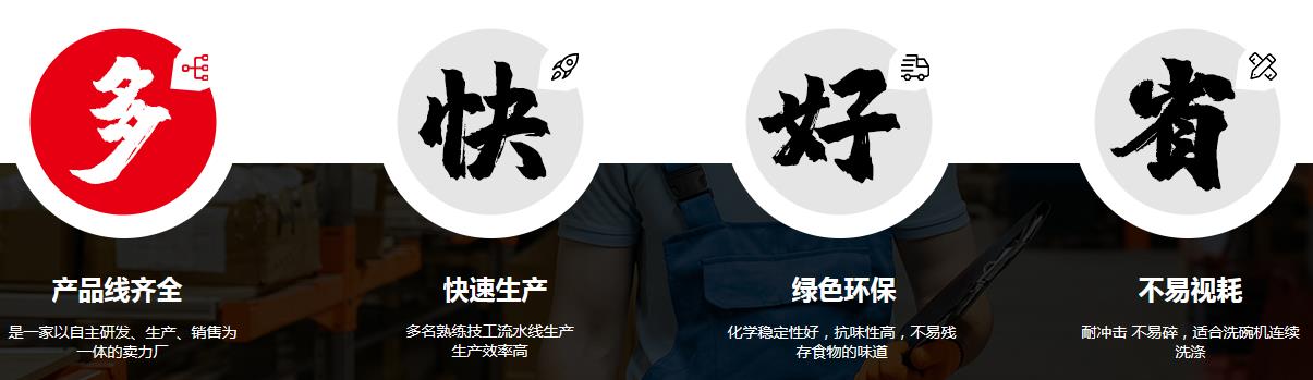 1、作為國(guó)內(nèi)密胺餐具的優(yōu)秀生產(chǎn)企業(yè),工廠所有的產(chǎn)品從設(shè)計(jì)、原料、生產(chǎn)工藝、市場(chǎng)銷售-直以“視質(zhì)量為生命,以服務(wù)創(chuàng)市場(chǎng)”為原則。
