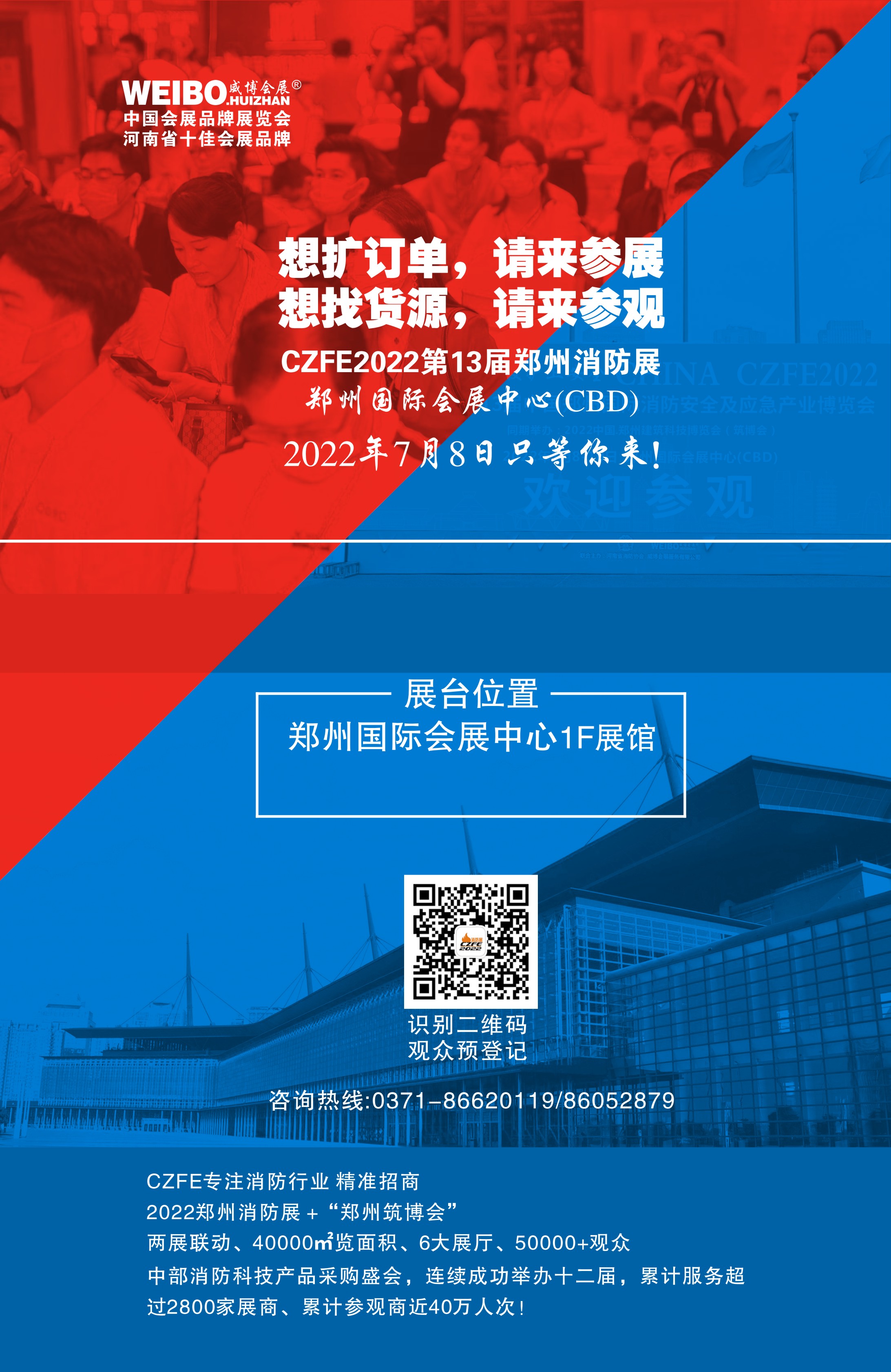 2022年第13屆鄭州國際消防展與2022年中國.鄭州建筑博覽會(huì)同期上演,六大展廳、1000+展商、40000㎡展覽面積、50000+觀眾,展覽規(guī)模全面升級(jí),廣大意向參展企業(yè),如您有計(jì)劃參加CZFE鄭州國際消防展,請(qǐng)盡快與組委會(huì)工作人員取得聯(lián)系,或通過大會(huì)官方網(wǎng)站/官方微信在線報(bào)名,收到報(bào)名后我們將盡快與您聯(lián)系。為避免使您的人力物力財(cái)力受到損害,請(qǐng)您認(rèn)準(zhǔn)大會(huì)唯一官方報(bào)名渠道。