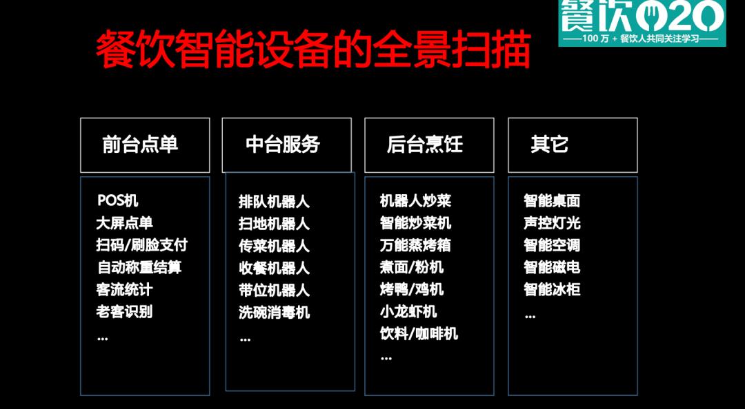 《2023年餐飲設(shè)備智能化發(fā)展報(bào)告》對(duì)餐飲業(yè)的智能設(shè)備進(jìn)行了全景掃描,根據(jù)流程環(huán)節(jié)分為四大類:前臺(tái)點(diǎn)單、中臺(tái)服務(wù)、后臺(tái)烹飪、其它。餐飲如何做設(shè)備智能化?關(guān)鍵就是:前臺(tái)極致個(gè)性化,后臺(tái)極致效率化。