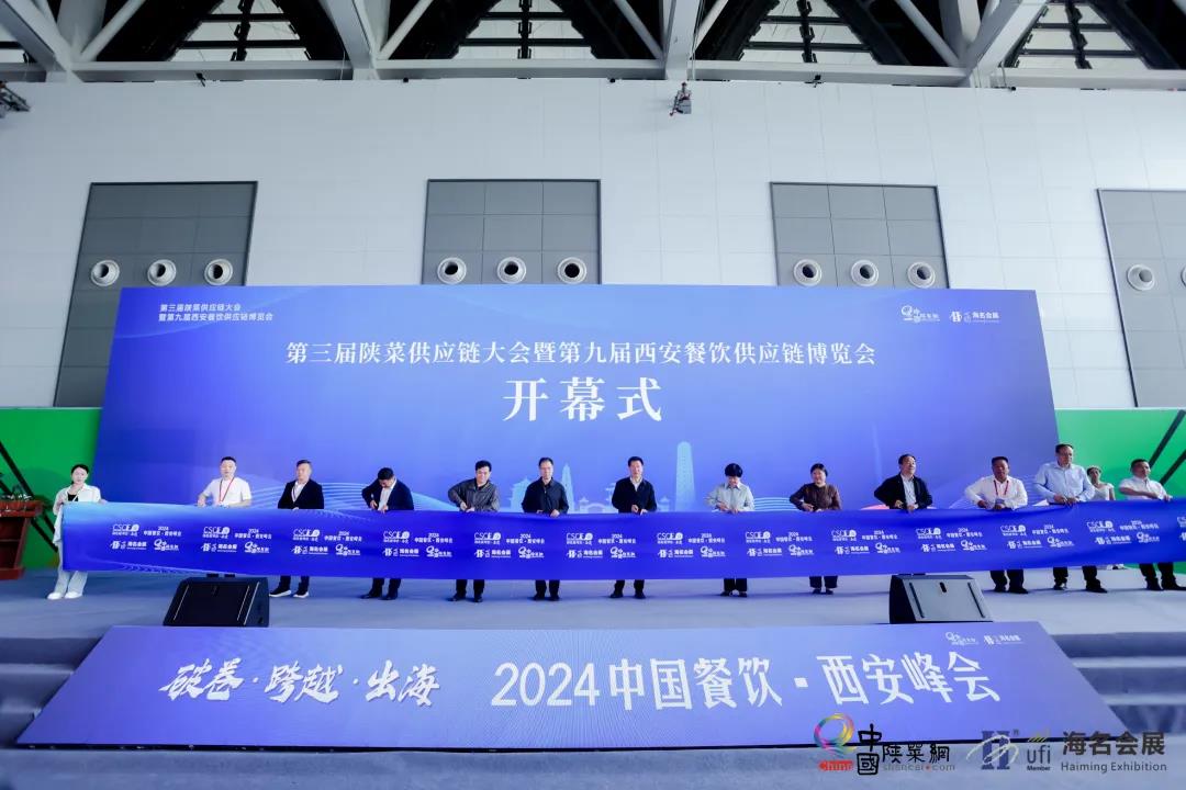 陜西省商務(wù)廳副廳長郭紹敏;陜西省三秦文化研究會會長張社年;西安市商務(wù)局一級調(diào)研員陸晴;陜西省三秦文化研究會副會長、陜西金控集團原董事長權(quán)永生;陜西省三秦文化研究會副會長王宏;陜西省三秦文化研究會副會長、陜西旅游集團總經(jīng)理任公正;重慶市小面協(xié)會會長張壽江;蘭州烹飪協(xié)會會長趙順謙;陜味食族油潑面創(chuàng)始人陳雷;深圳老碗會創(chuàng)始人楊富強;陜西省餐飲聯(lián)合會駐會會長黨小兵;西安飯店與餐飲行業(yè)協(xié)會會長王小唐共同剪彩,第三屆陜菜供應(yīng)鏈大會暨海明·2024第9屆西安餐飲供應(yīng)鏈博覽會正式啟動。