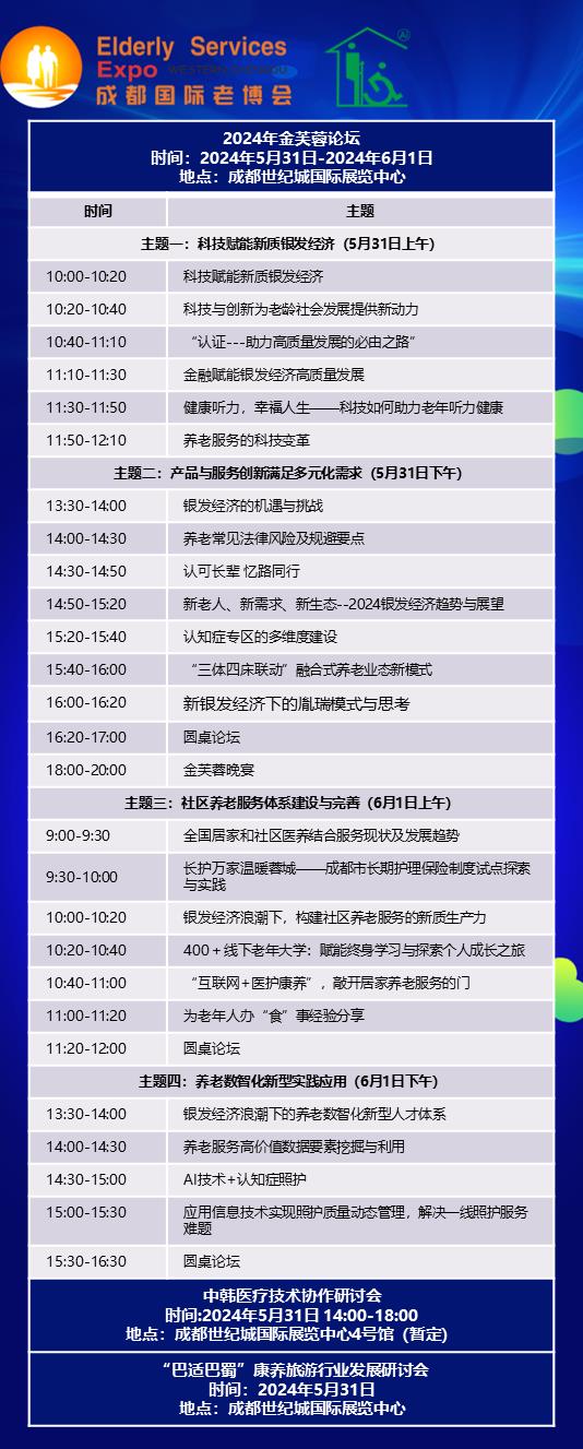 主論壇為2024金芙蓉養(yǎng)老論壇,論壇以“深耕銀發(fā)市場,力促享老騰飛”為主題。從政府、市場、社會及家庭四個層面,圍繞科技賦能、社區(qū)養(yǎng)老、養(yǎng)老數(shù)字化等社會關(guān)注的熱門話題,進(jìn)行深入討論,助力享老服務(wù)邁向更高的臺階。此外,還將召開中韓醫(yī)療技術(shù)協(xié)作研討會以及“巴適巴蜀”康養(yǎng)旅游行業(yè)發(fā)展研討會,邀請展商和觀眾共同參與!