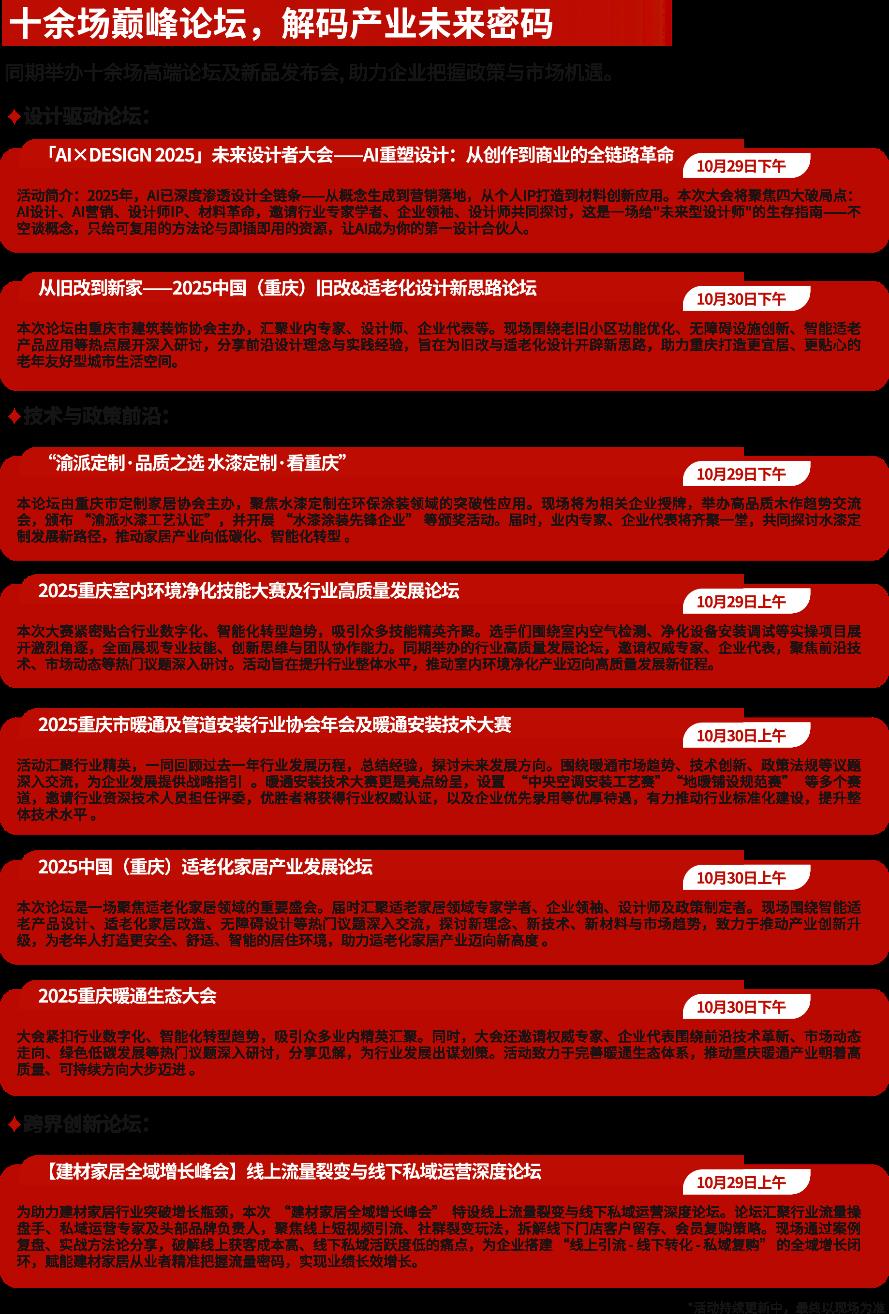 作為下半年西南大家居建裝行業(yè)發(fā)展的風向標,10月29-31日,萬眾期待的第三屆中國(重慶)建筑及裝飾材料博覽會(簡稱:2025CCBD中國重慶建博會)即將在重慶國際博覽中心盛大啟幕。