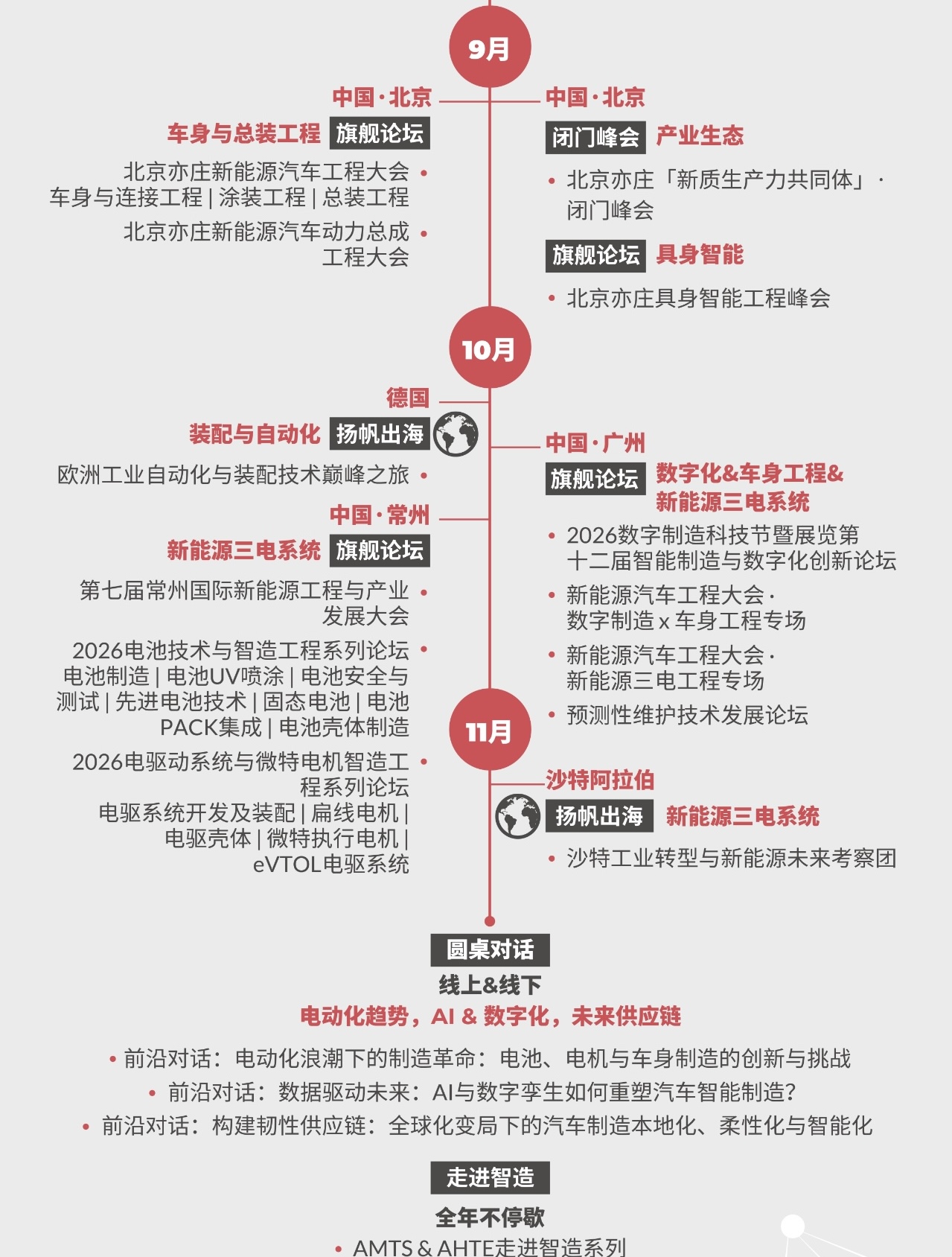2026年,我們將推出多種活動形式,覆蓋旗艦論壇、閉門峰會、主題系列會議、Workshop科技工坊、Techshow高新科技發(fā)布、圓桌對話、科技導覽、揚帆出海、先鋒獎項、走進智造、商務酒會等全維度活動,為您呈現一場多元化的創(chuàng)新生態(tài)體驗。從聚焦沖焊涂總工藝的新能源工程大會、探索前瞻開發(fā)與測試技術的專業(yè)論壇,到深度研討前沿科技的TechShow & Workshop;從沉浸式國內外智造產線工廠考察,到促進深度鏈接的圓桌會議、交流晚宴與精準配對,通過旗艦峰會、主題會議、Workshop科技工坊、出海及商務考察等全維度活動打造集技術洞察、知識共享與商業(yè)合作為一體的高端平臺。