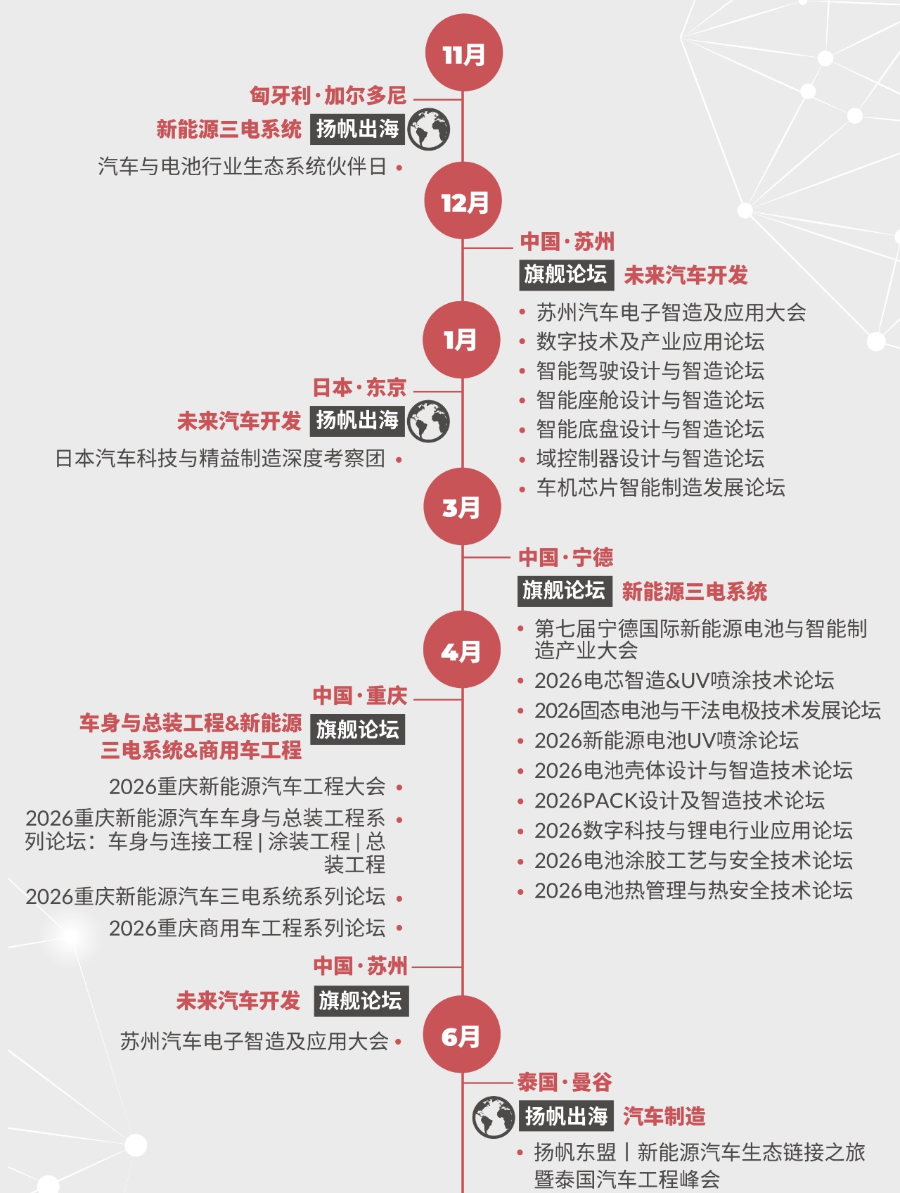 2026年,我們將推出多種活動形式,覆蓋旗艦論壇、閉門峰會、主題系列會議、Workshop科技工坊、Techshow高新科技發(fā)布、圓桌對話、科技導(dǎo)覽、揚(yáng)帆出海、先鋒獎項(xiàng)、走進(jìn)智造、商務(wù)酒會等全維度活動,為您呈現(xiàn)一場多元化的創(chuàng)新生態(tài)體驗(yàn)。從聚焦沖焊涂總工藝的新能源工程大會、探索前瞻開發(fā)與測試技術(shù)的專業(yè)論壇,到深度研討前沿科技的TechShow & Workshop;從沉浸式國內(nèi)外智造產(chǎn)線工廠考察,到促進(jìn)深度鏈接的圓桌會議、交流晚宴與精準(zhǔn)配對,通過旗艦峰會、主題會議、Workshop科技工坊、出海及商務(wù)考察等全維度活動打造集技術(shù)洞察、知識共享與商業(yè)合作為一體的高端平臺。